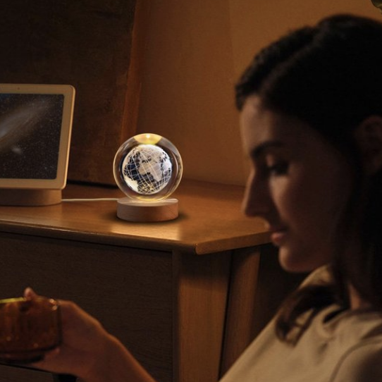 3D Kristallen Universe LED Lamp – Glas Bol met Houten Basis – Nachtlamp & Cadeau