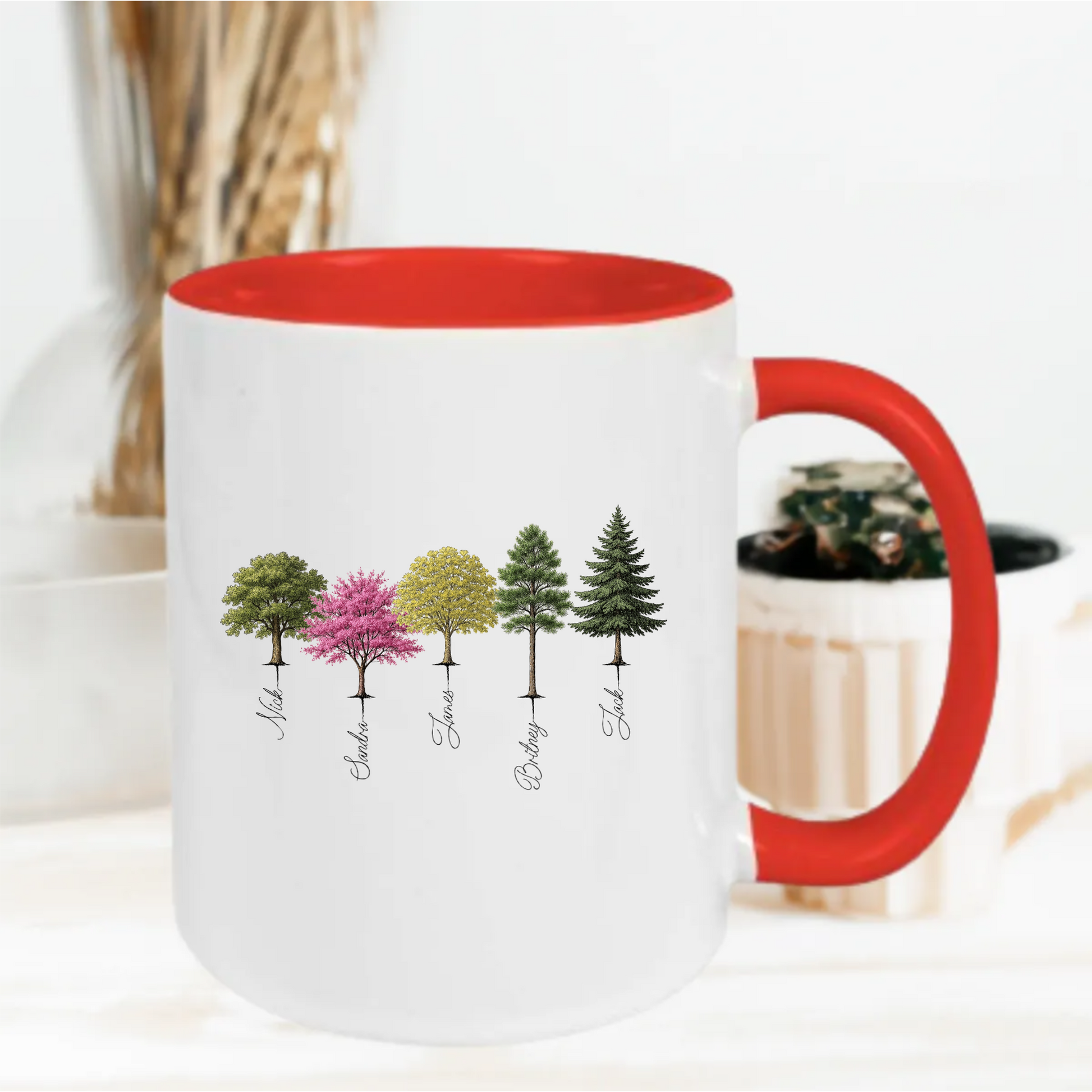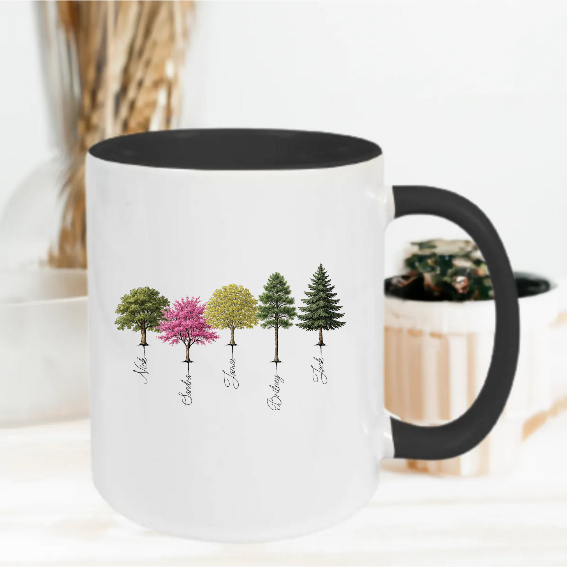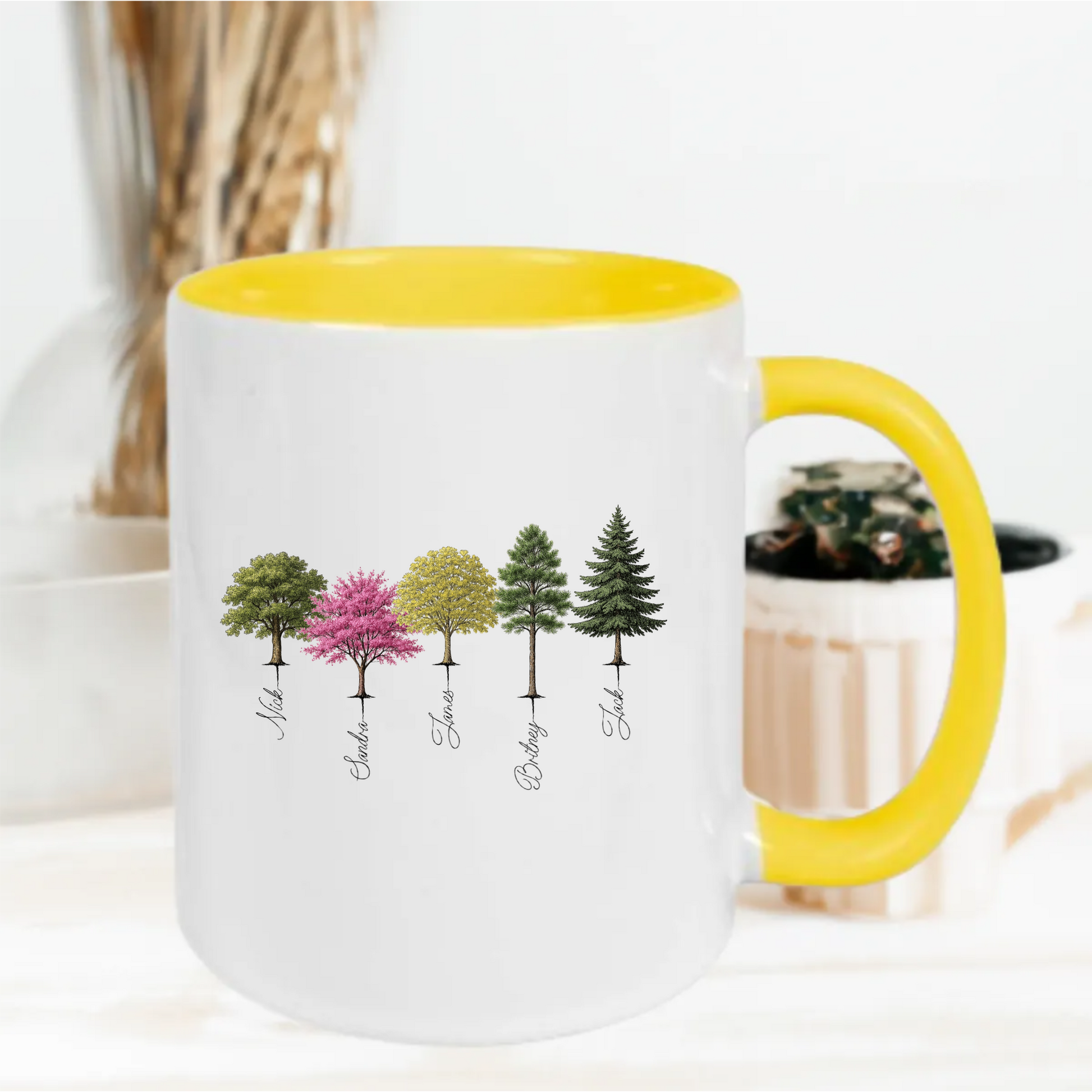 Elke boom op de mok symboliseert een familielid — samen vormen ze een prachtige stamboom vol liefde.