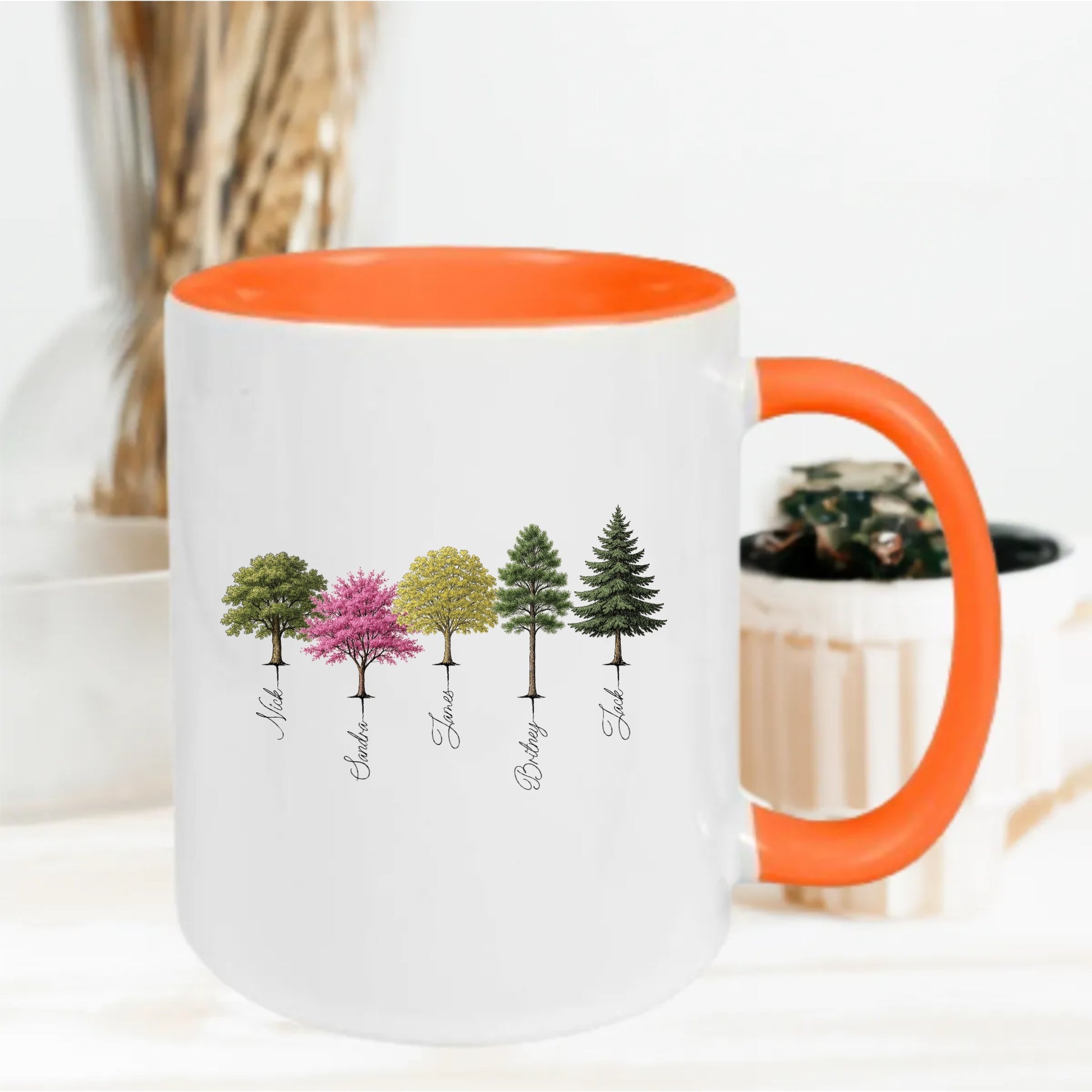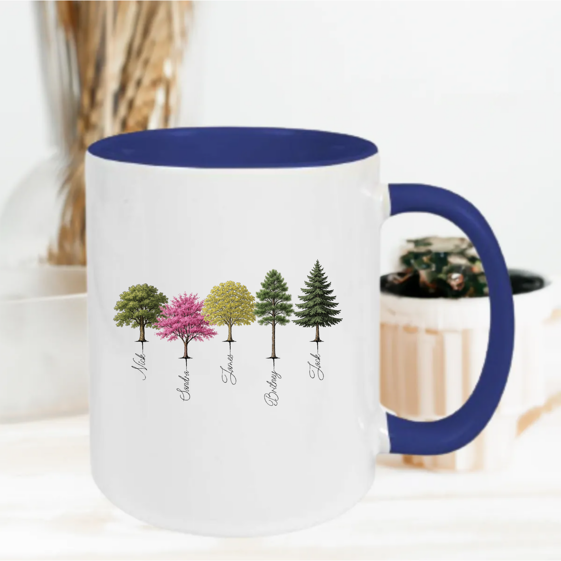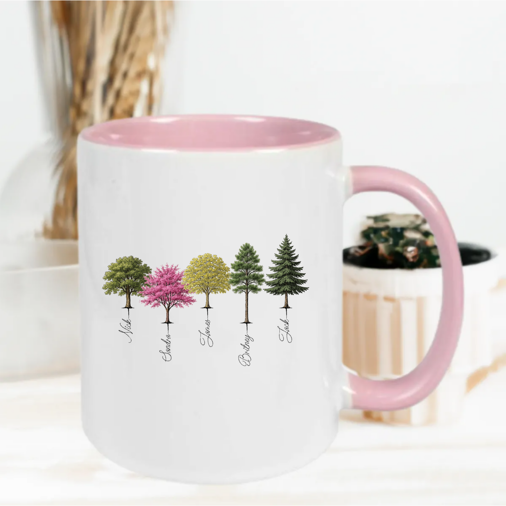 Elke boom op de mok symboliseert een familielid — samen vormen ze een prachtige stamboom vol liefde.